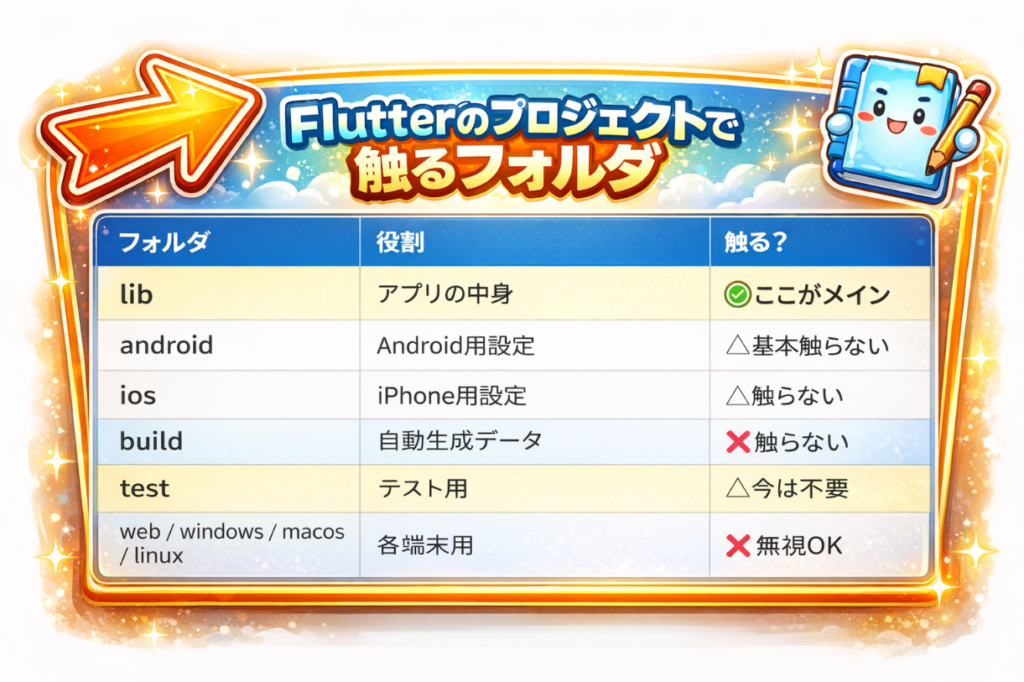 Flutterのフォルダ構成は一見複雑ですが、初心者が最初に触るべき場所はとてもシンプルです。